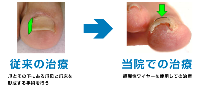 従来は爪とその下にある爪母と爪床を形成する手術を行うことが多かったのですが、超弾性ワイヤーや形状記憶プレートを使用することにより、ほとんど痛みなく、また、手術に見られるように爪を細くするようなことも必要なく、治療することが可能です。