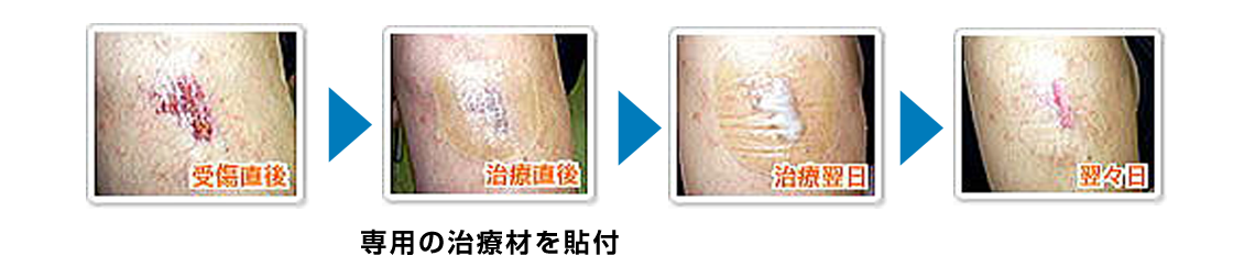 このような方法で、傷を治すと従来の消毒してガーゼの方法より短期間で治ります。もちろん傷によっては、麻酔をかけて縫合が必要な場合や、異物を取り除くことが必要な場合があります。この際でも、なるべく痛みを感じないよう麻酔を打つように工夫しています。