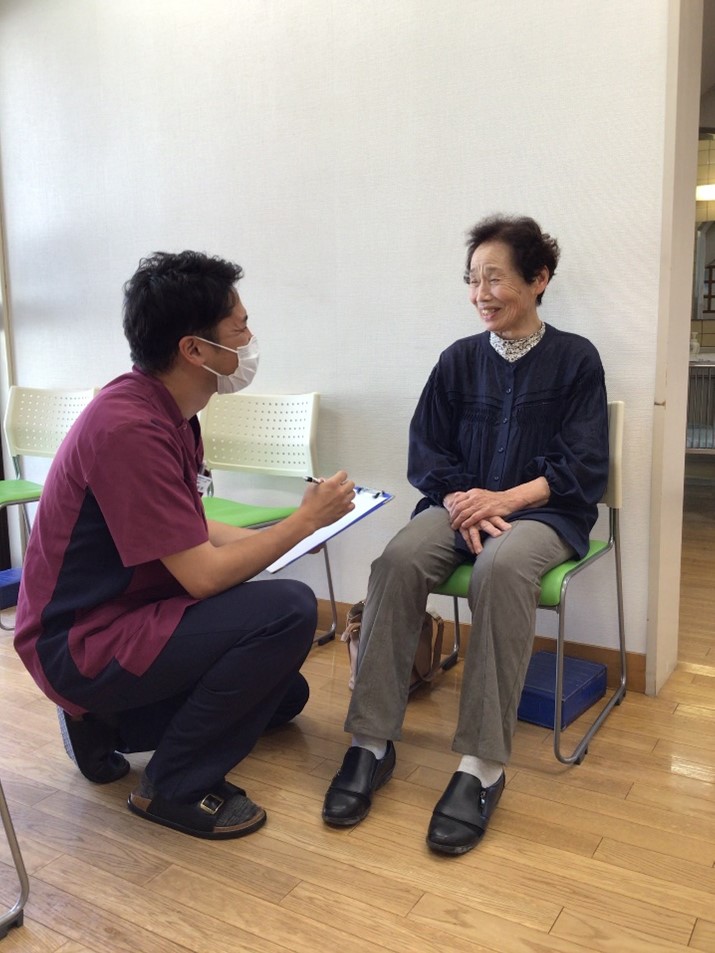 患者様の症状について理学療法士が問診します。日常生活で困っていること、痛みの部位、痛みの出現動作などについて問診します。