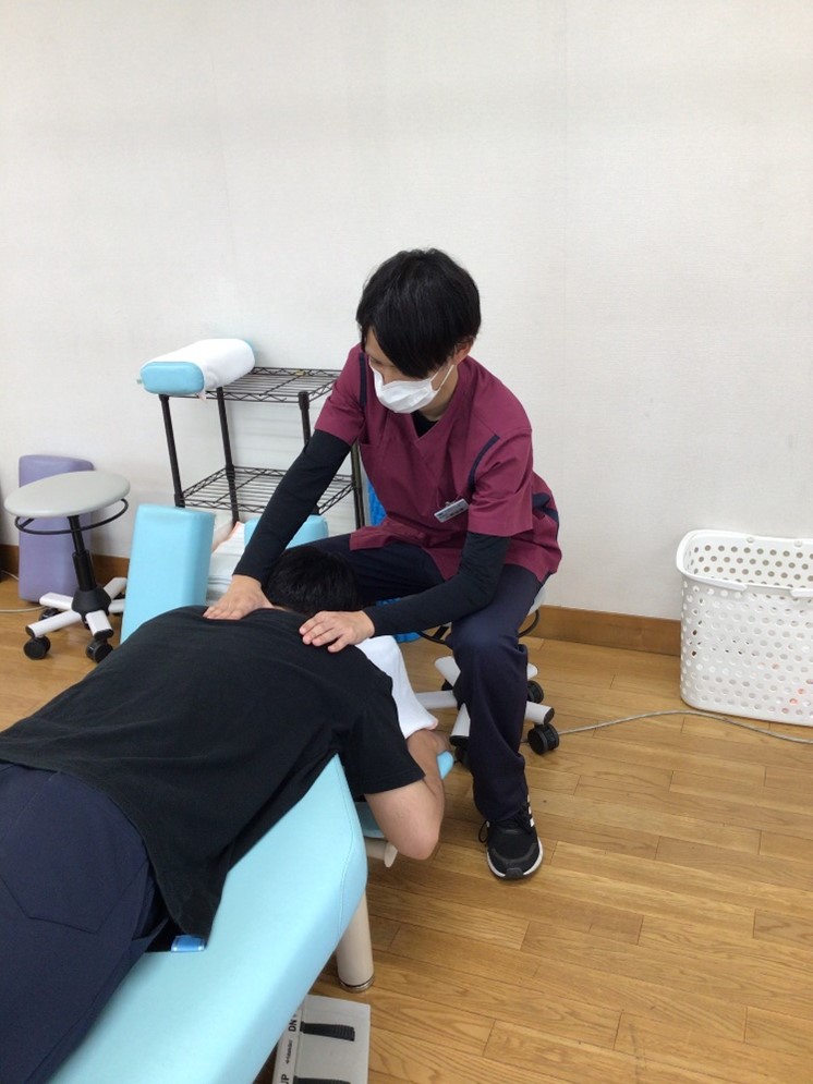 初診時は痛みと可動域制限があり、朝起床時や仕事(デスクワーク)に支障が生じていたが、徐々に痛みと筋肉の張り感が軽減した。