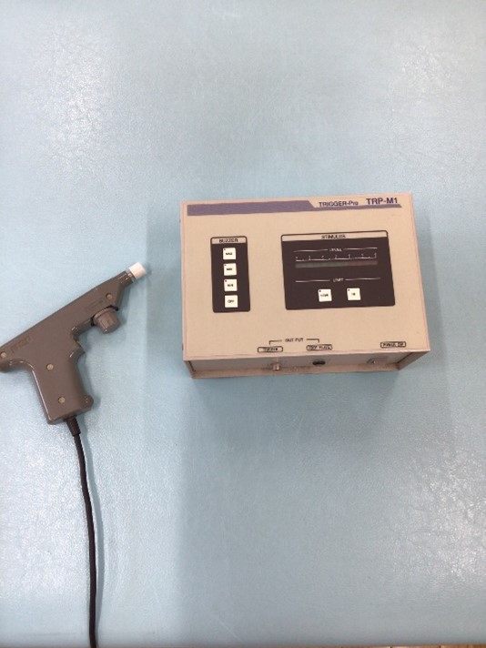 | 機能 | 出力電流:MC 1mAp以下/ HV 40mArms以下 出力電圧: MC 3.6Vp/ HV 480Vp 出力周波数:MC 0.3~900pps/ HV 0.3~300pps ※電圧、周波数値は精度±20% 治療時間:10分 |
