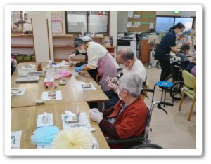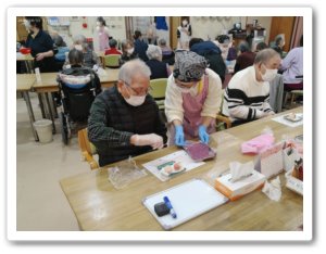 2月13日(金)に練り切りのイベントを開催しました。材料の練り切りあんを用意し、ナリコマスタッフ様のサポートの下、利用者様が自分の分を自分で創作し召し上がって頂きました。