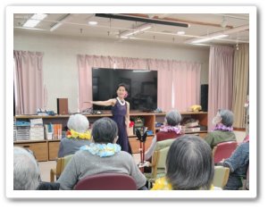 2月20日(金)に、「マカナアロハフラダンス」様をお招きし、フラダンス公演を開催しました。全8曲を1時間かけて披露して頂き、ハワイの簡単な言葉やお馴染みのふるさとに合わせたダンスをレクチャーして頂きました。この公演に感化されたのか?終わった後も教えて頂いた言葉で挨拶をしたりして、スタッフも利用者様もハワイ気分を楽しんだ一日になりました。