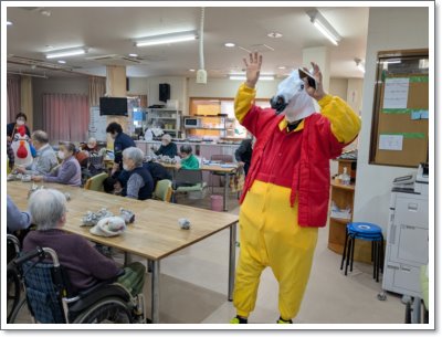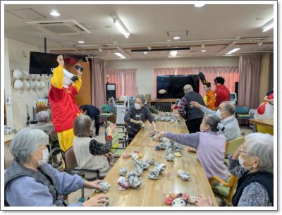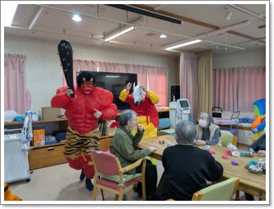 2月3日(火)の節分にあわせ、昼食はみんなで恵方巻を頂き、豆まき大会を実施しました。まるで仮装大会のような衣装をまとった職員に向け、豆と見立てたお手玉を投げ邪鬼を祓い、福を呼び込むことに成功しました!
