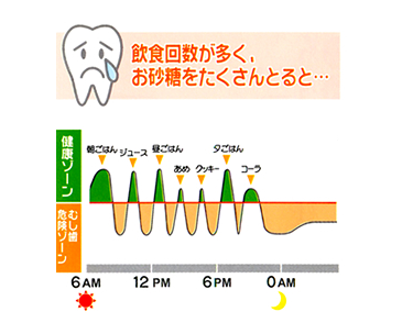 リズムある食生活をしていると、お口の中が健康ゾーンでいる時間が長くなり、虫歯の危険は低くなります。